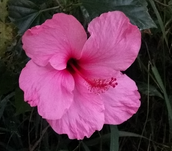 扶桑花, 通常是玫瑰紅色, 重瓣者非漏斗形, 呈紅、黃、粉、白等色, 花期全年, 夏秋最盛。 別名朱槿、大紅花、朱槿牡丹。