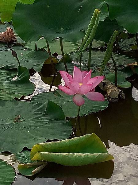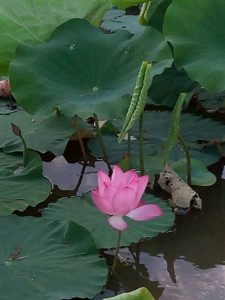 在靠近路旁處, 獨開一朵水上蓮, 雖在路旁, 但 仍在水池裡, 拍照時, 仍然無法太靠近, 以免落入水中。