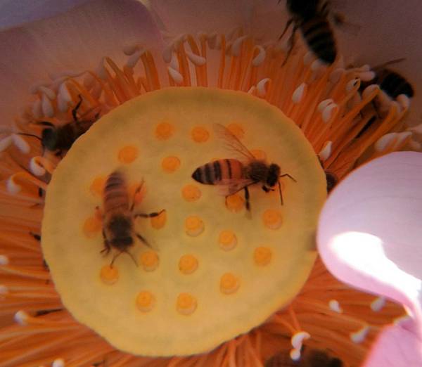 蓮田裡, 蜜蜂汲汲採著花蜜。 當手機 接近拍攝時, 牠們 如雷達般的警覺心, 立刻起飛, 圍繞身邊, 很怕 一不注意惹怒牠們, 發動攻擊。 所以, 常常無法好好拍攝。 這次, 家人以攝影機 遠距離拍攝, 便可以 好好的將蓮花盡收眼底。 順便, 將蜜蜂採蜜的忙碌現狀, 妥妥當當的拍攝下來。
