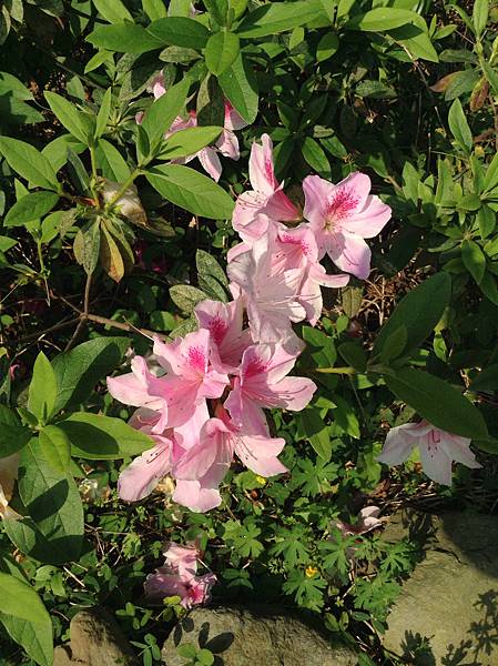 在石階路旁, 種植著 許多矮叢的杜鵑花, 有白色、紅色、粉色。